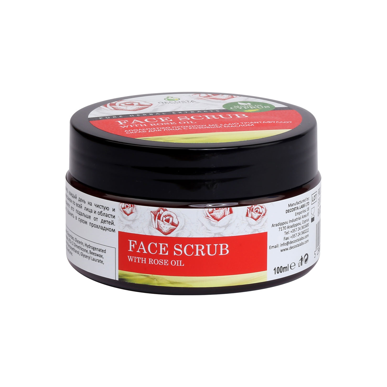 Perfume your skin with the delicate aroma of rose petals contained in this face scrub while also buffing and protecting it.We have been cultivating this unique species of rose for many years, as it thrives in Cyprus’ mild sunny climate, extracting the oil from the petals in our labs for use in our products.Rose oil is a potent anti-inflammatory, loaded with therapeutic benefits for the skin. It is a tissue regenerator, soothing irritated skin, and an excellent moisturiser. A great cleanser and astringent, it is perfect for reducing redness, closing open pores and for prepping the skin for other products.It smells beautifully, so will put you in a good mood, relax you and help you sleep better.Perfect for all skins, the tiny zeolite gently remove dead skin, while the rose oil cleanses and soothes. It is especially good for people with sensitive skin.