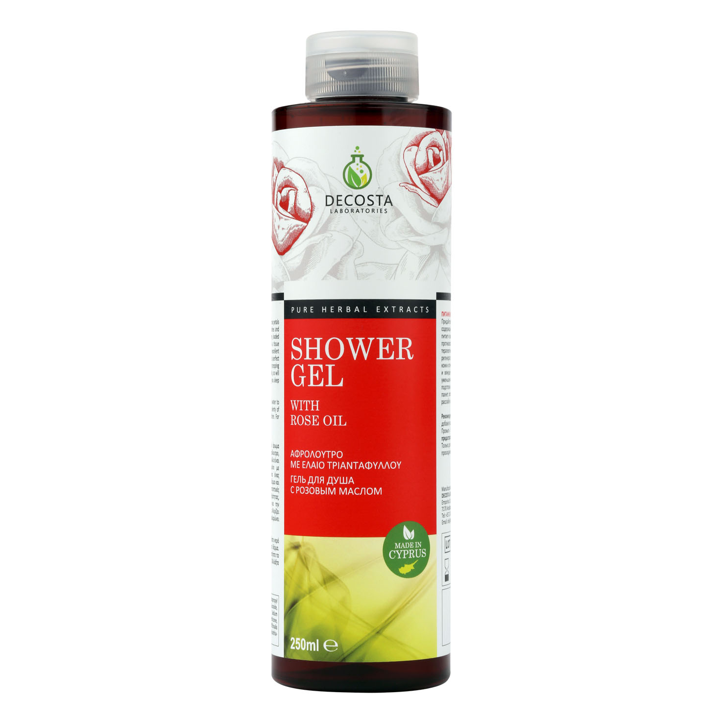 Perfume your skin with the delicate aroma of rose petals contained in this shower gel that also nourishes and protects.We have been cultivating this unique species of rose for many years, as it thrives in Cyprus’ mild sunny climate, extracting the oil from the petals in our labs for use in our products.Rose oil is a potent anti-inflammatory, loaded with therapeutic benefits for the skin. It is a tissue regenerator, soothing irritated skin, and an excellent moisturiser. A great cleanser and astringent, it is perfect for reducing redness, closing open pores and for prepping the skin for other products.It smells beautifully, so will put you in a good mood, relax you and help you sleep better.